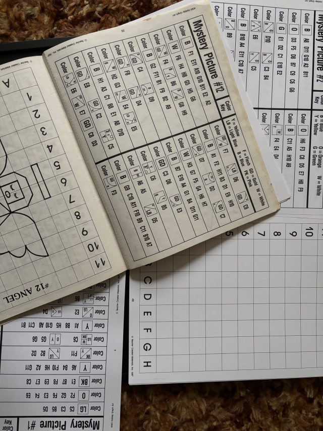 Last week I ended with this picture and asked if you’d ever colored one of these. They’re mystery pictures with color keys indicating which colors to use in which blocks. If one follows the directions correctly, your coloring reveals a picture. In this book the pictures are all holiday images–a pumpkin, angel, heart, etc. Because of how the directions are listed, the squares are colored in random order so the design isn’t revealed right away. I used them when I was homeschooling and introducing my kids to graphing. Now I’m just having fun with the Grands with them.