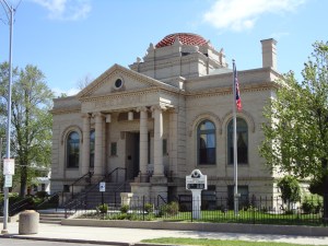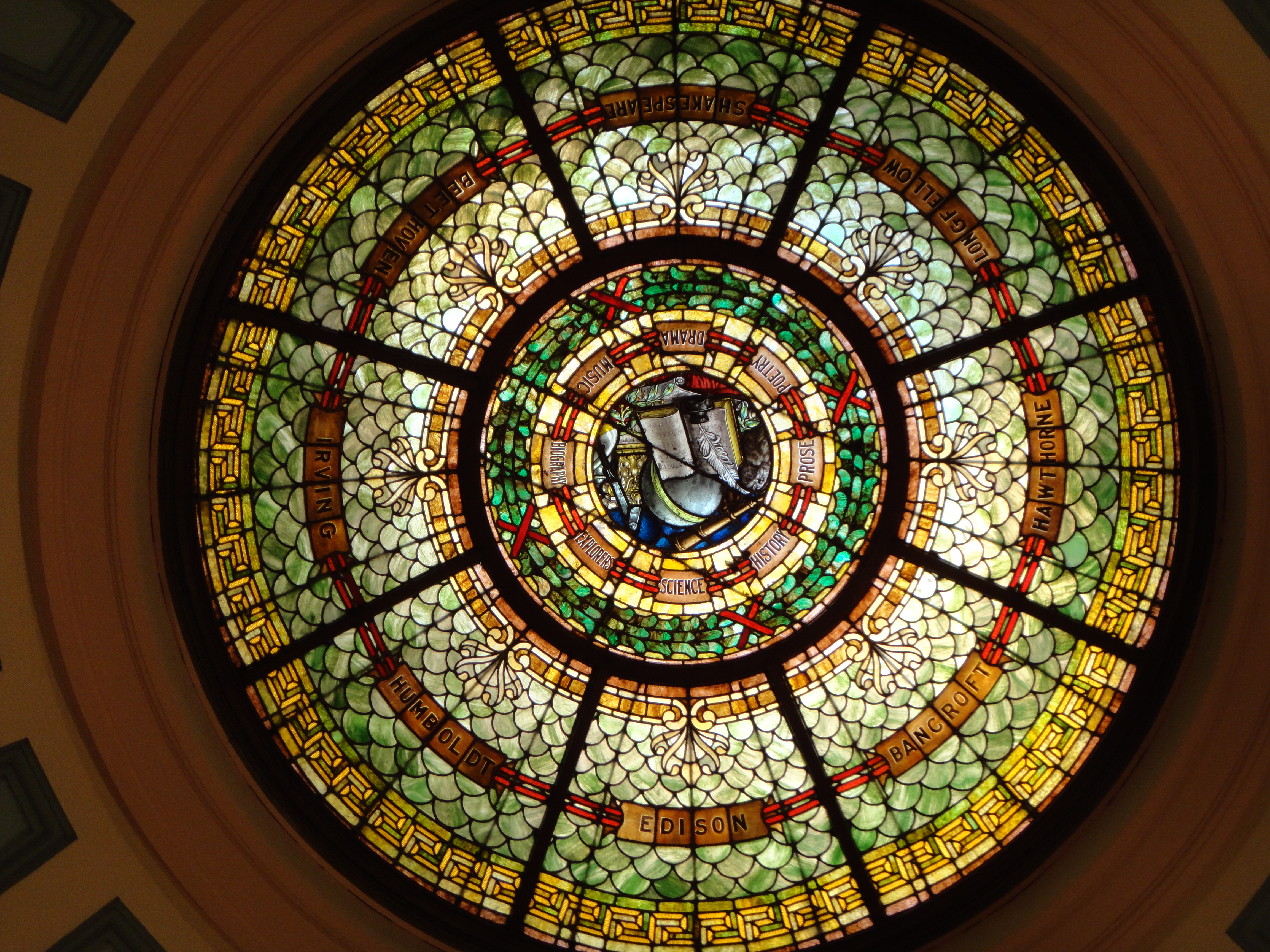 This is the one my mom walked me to, even before I could read. It was built in 1904, one of Andrew Carnegie’s libraries. The stained-glass window inside the domed ceiling mesmerized me for years. I couldn’t wait to know the people whose names -Longfellow, Humboldt, Edison, Poe, Hawthorne, Shakespeare – rimmed the edge. I remember thinking the library was one of the most beautiful buildings I’d ever seen. I still do.
