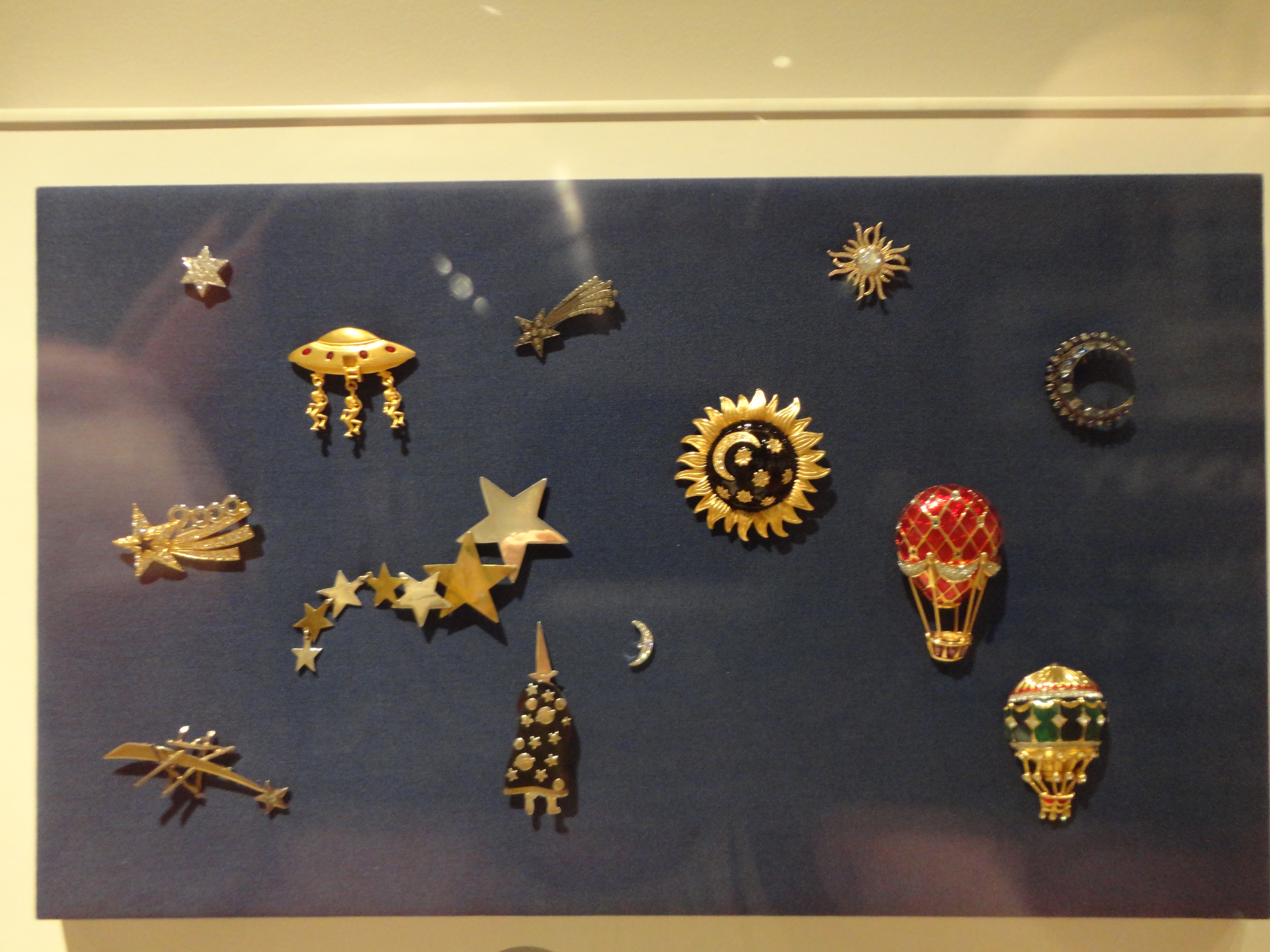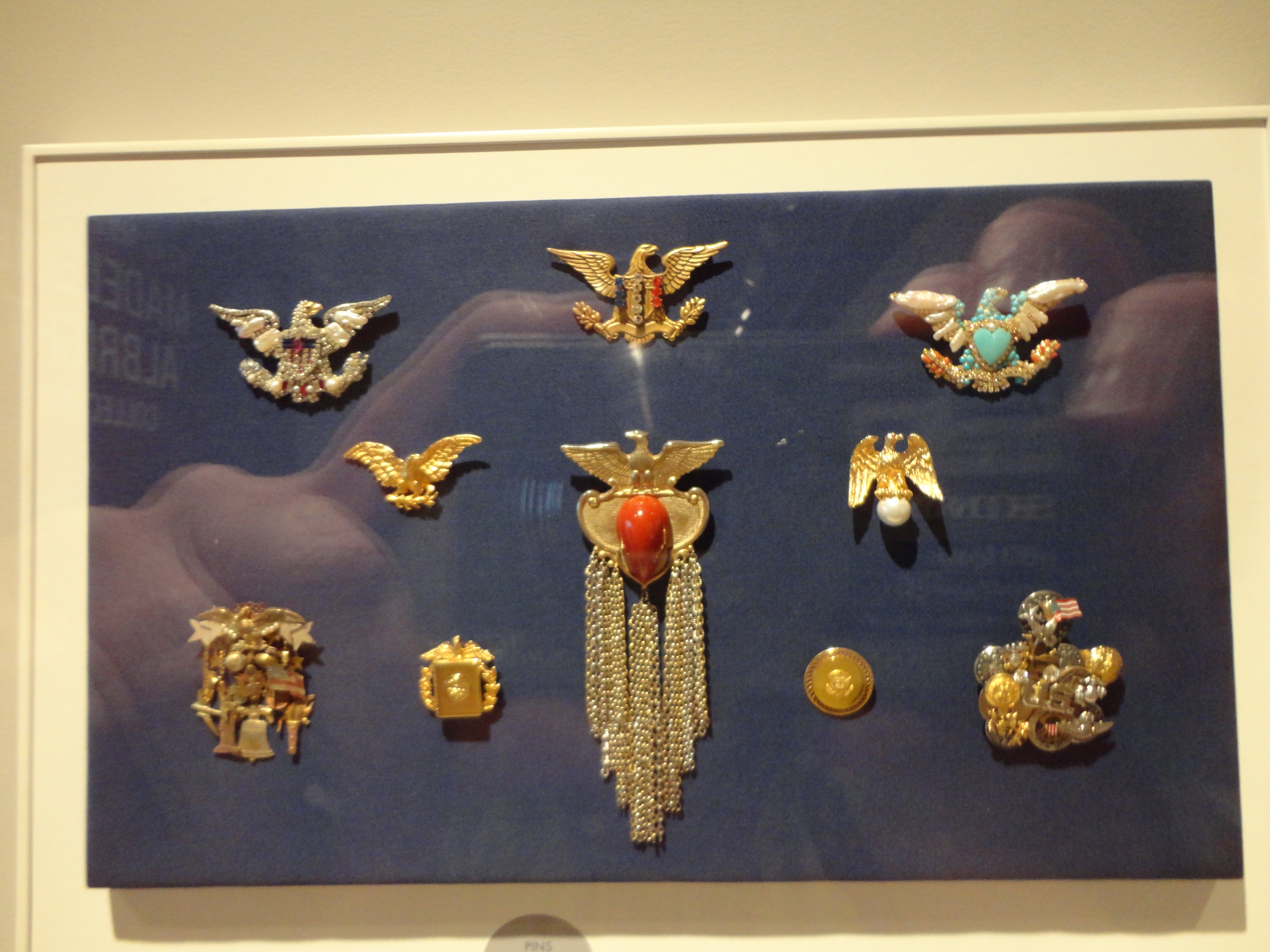 Even without the diplomatic or historical significance, the pins are worth seeing. They include antiques from the late 1800’s to modern pieces. They were acquired from countries all around the world and those cultures are reflected in the pins. They are made from all kinds of materials, gems and even a piece of concrete from the Berlin Wall. Just about every animal, sea creature, bug, flower, fruit and vegetable is represented-at least once. There is one case with just spiders! The pins cover the spectrum from the serious and political to the whimsical-who knew Madeleine Albright was a fan of Star Trek?!