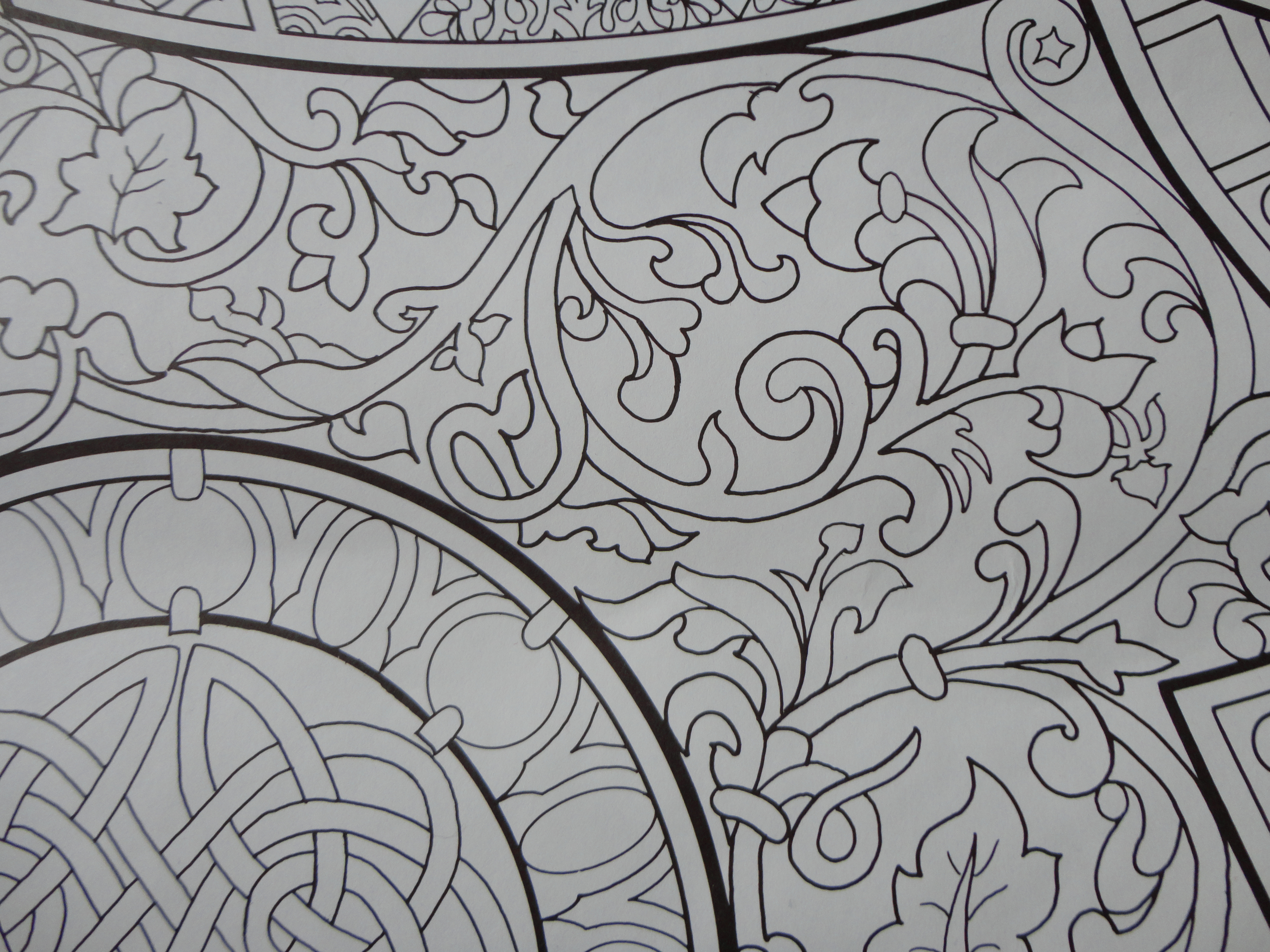 The beauty and challenge of the design is the intertwining. We’d begin coloring one leaf and end up following a vine twisting and turning across the paper. Sometimes we’d start a flower then butt against where someone else had started with a different color in another area. Watching the design gradually fill in was a little like time-lapse photography – the slow revealing of the picture.