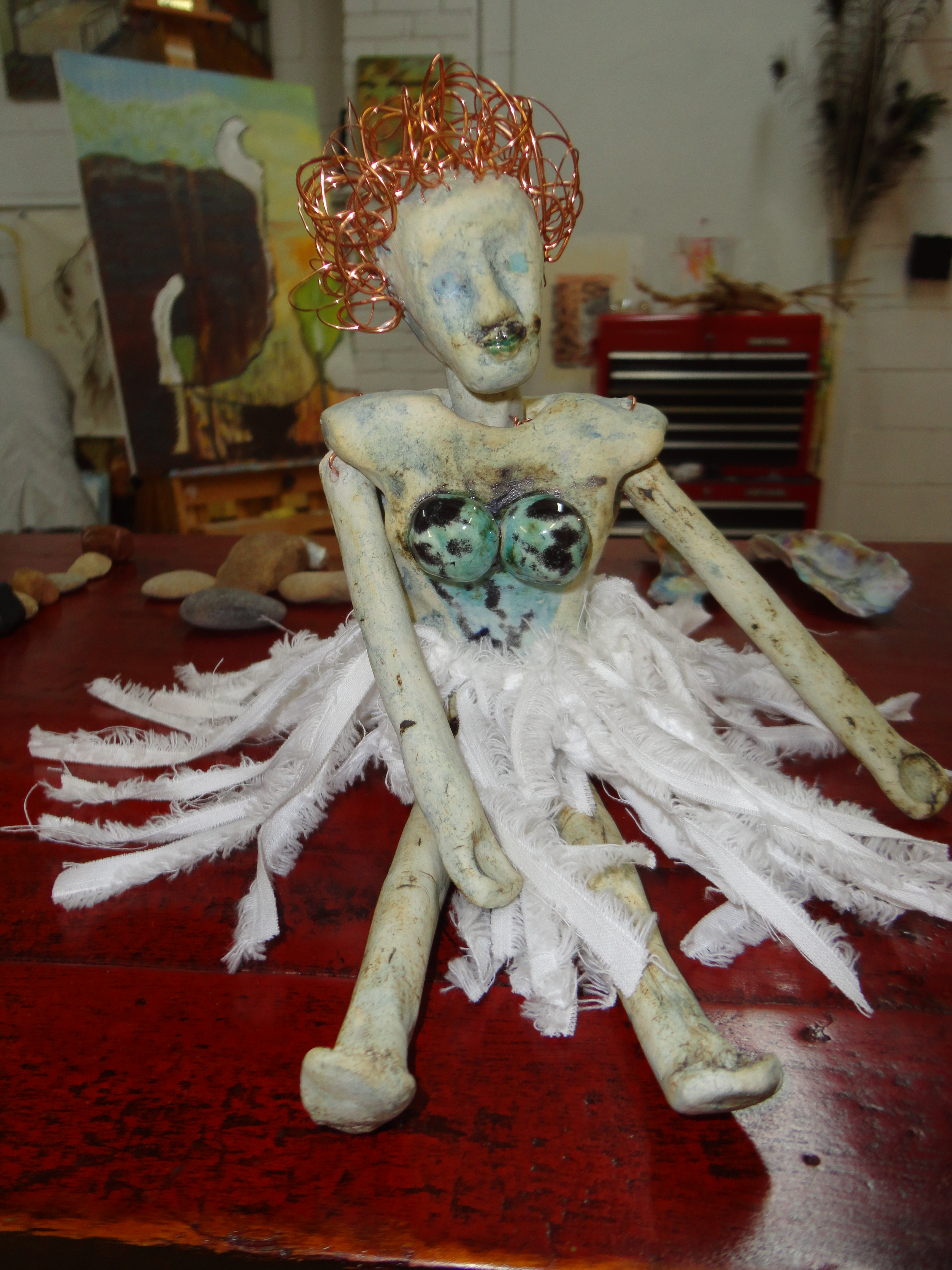 DSC00912Each artist’s studio reflects her personality and art, but centering it all is the sacred space where each burns a candle when they arrive. And it’s that sense of creative, sacred space that permeates from the walls and that I feel in my bones. On the shelf with the candles is a buxom angel, formed in clay by artist and writer Rebecca Haworth. Rebecca is one of the original members of the collaborative and I asked her to tell us the story …