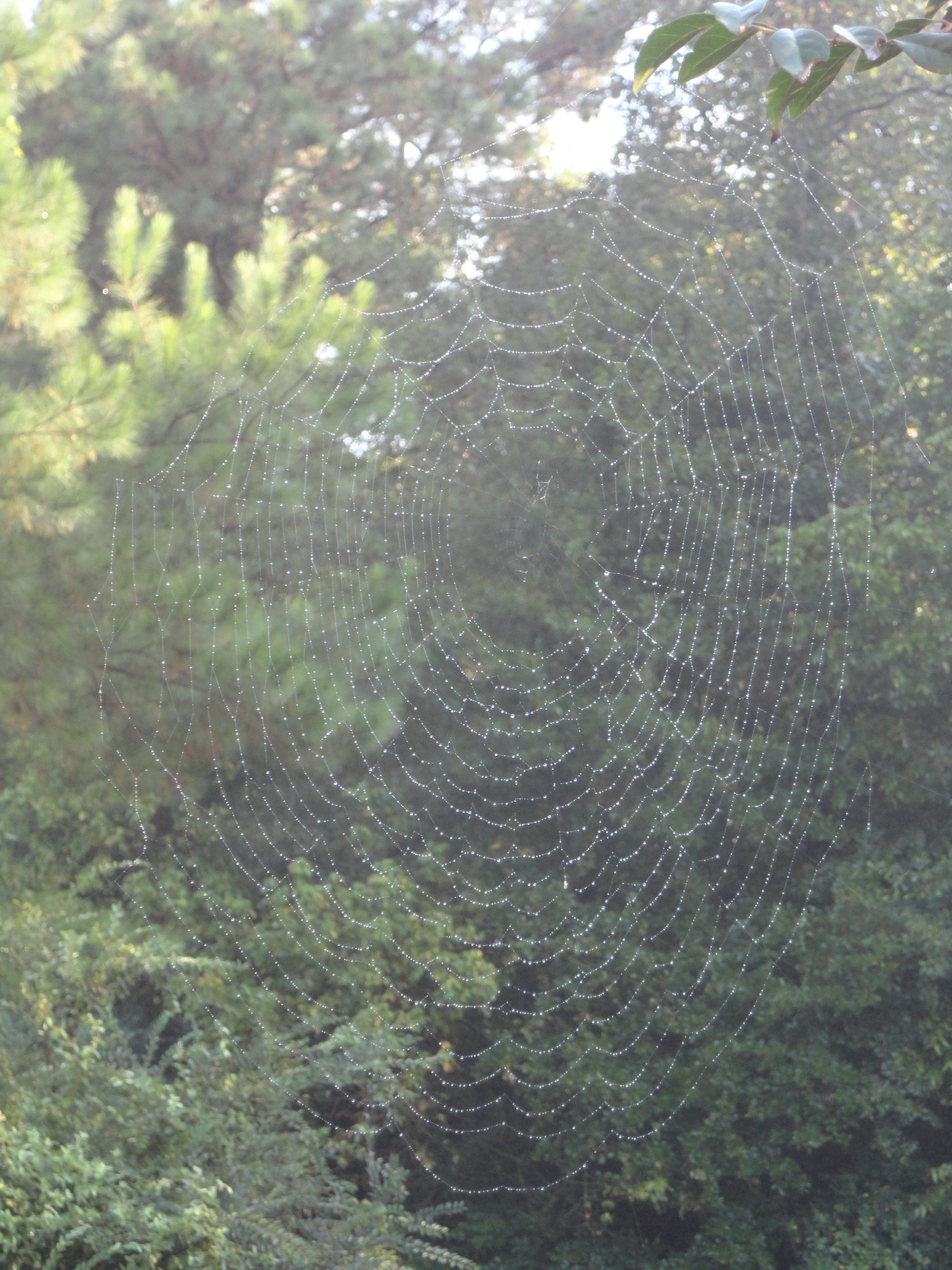 The web looks like an oval Victorian mirror, so beautiful and I try to come up with a description that isn’t such a cliche. As the dew falls and dissipates, and the nandina branches lighten and rise, what will happen to the web? Will it stretch or will it break? I think of the spider’s diligence and perseverance making the web during the night. (It’s always at night isn’t it? Then we walk into them in the morning when we don’t know they’re there – Yuck!)