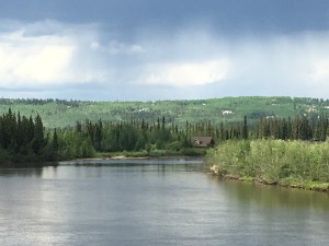 Throughout our travels we saw beautiful rivers rushing, and waterfalls cascading thousands of feet. We took a riverboat cruise on the Chena River, the water so smooth there was barely a ripple. Because the river is so far from the ocean there are no tides. Unlike in Juneau where the variation of tides is greater than anywhere else in the United States – the variation can be up to 30 feet in one day! They have high-high tide, high-low tide, low-high tide and low-low tide. This is a shot of the Chena River from the riverboat.