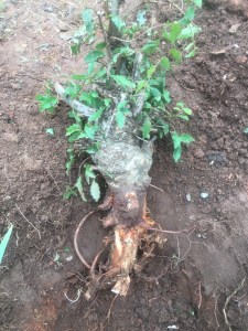 I dug, pushed and pulled to loosen the stump. At one point I took a hack saw to a large runner. It started raining but I didn’t stop. Eventually I was able to reach in and actually feel the space beneath the tap root, still 12 inches down into the hole, but there was a bottom! After snipping its last few runners I got the shovel, leaned my full weight onto the handle again and pushed. The whole digging took several hours, my arms and back ached that night but it was so worth it.