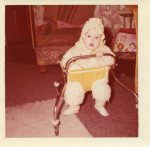 One of our strongest snow memories of Dad comes from when we were really little – him pulling us on a wooden sled through the old neighborhood on Summit St. Dad took a wooden liquor box from the state liquor store where our Grandpa worked, and screwed it to the back of the sled. We’d sit in the box, tucked in with blankets, and all dressed warm in snow suits, boots and mittens. Lynda remembers the snowflakes smacking her rosy little cheeks as Dad jogged a little making us go faster.