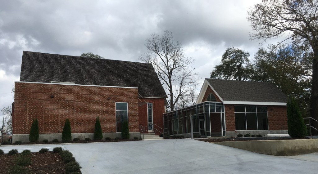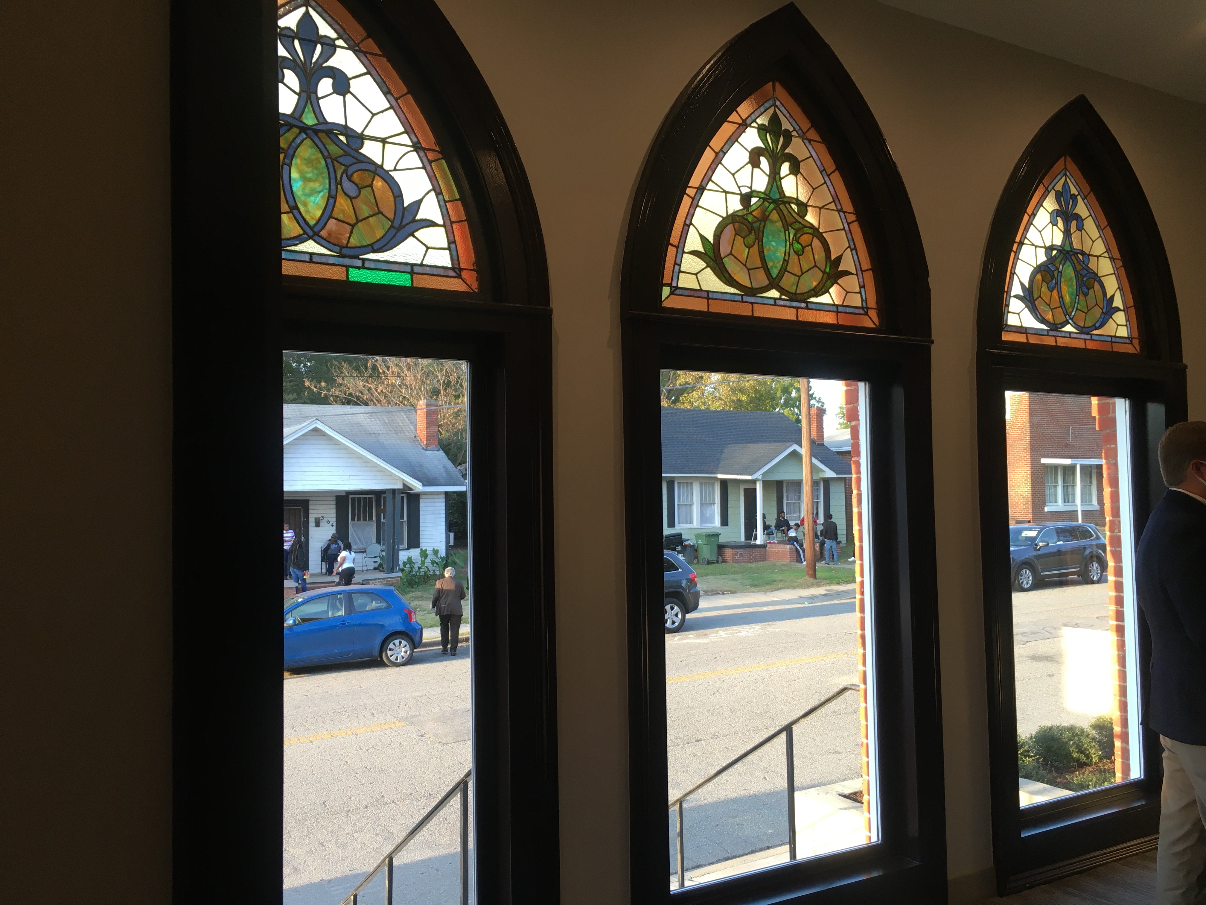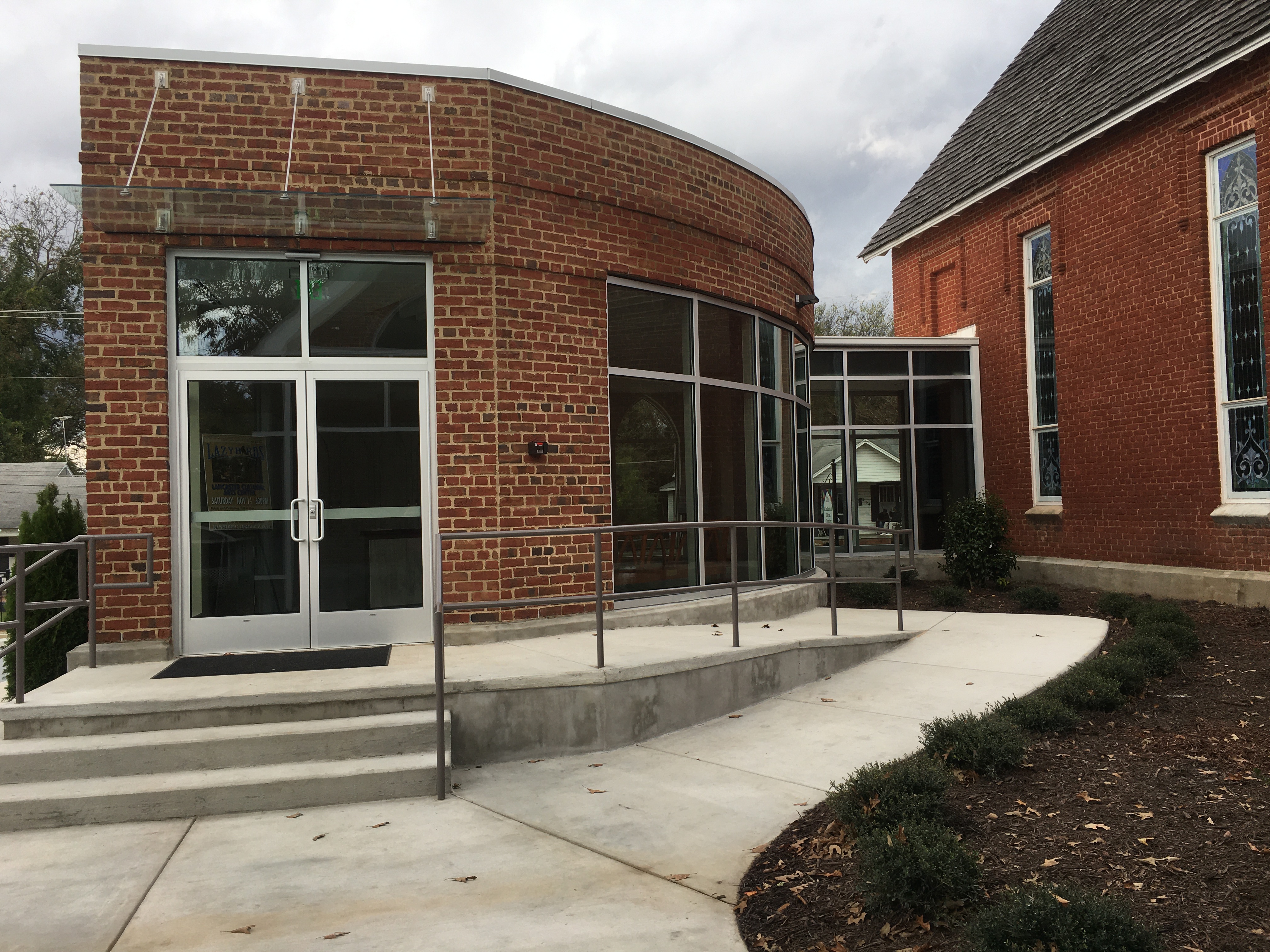 This post is about that another beginning . . . In 2019 ground broke for new additions – a lobby and green room with kitchenette. Last week those additions were revealed during a ribbon-cutting and open house. Lancaster native Jimmy Wilhide of Charlotte-based Mosley Architects designed the additions, keeping the integrity of the historical church intact, while creating a beautiful and functioning performance space. John Craig, President of the Lancaster County Society for Historical Preservation, used the word ‘recast’ during the ceremonies. Lancaster’s Cultural Arts Center is a classic example of how old buildings can be recast with new life.