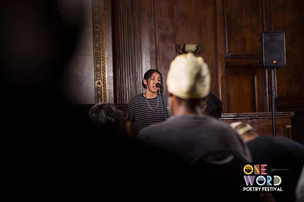 When the poet stands at the microphone you can watch them transform into the performer they’ll become for the timed recitation of their work. Saturday’s time limit was 3 minutes and 10 seconds. One poet was docked a full point for going over. There were three rounds with eliminations after each until the final. The poets and the audience were sweating, and not only because the room was packed and the air humid.