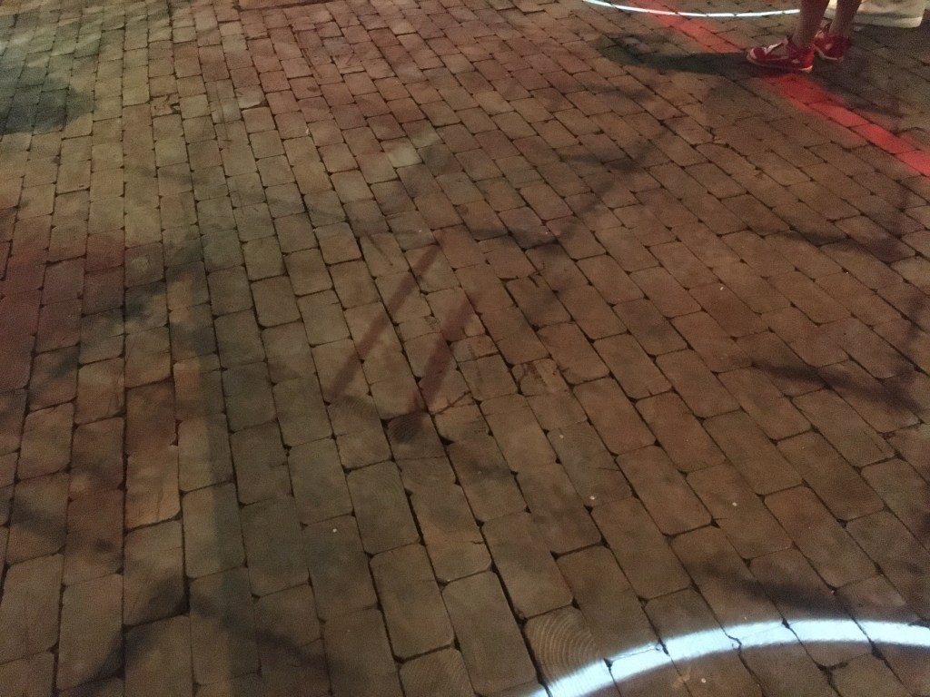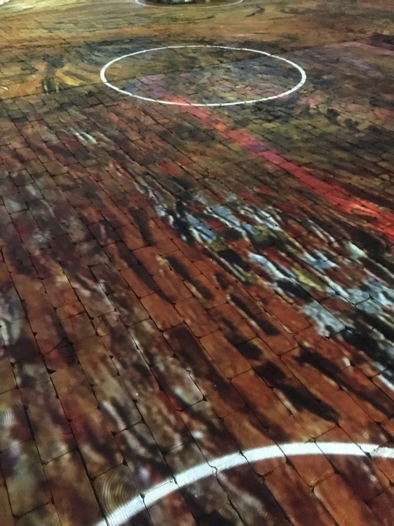 Even the floor becomes part of the art so you’re literally in the painting. The floor of this particular converted art space is wooden blocks of different sizes. This added another dimension of texture as Van Gogh’s paint spread across the room. (the white circles are for social distancing)