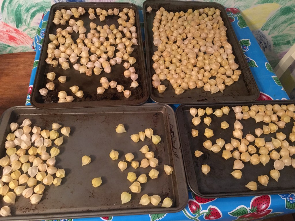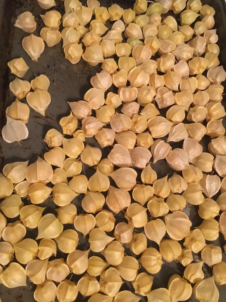 And of course now that I’m a Nana, I’ve shared and introduced the flavor to my grands. Even though I have my grandma’s cabinet, my cookie sheets of ripening ground cherries were on my dining room table. The boys loved them. They’re not as sneaky as me. They politely ask if they can have another one. Or they grab a handful and politely ask, ‘May I have all of these?’ Luckily I’m not making pies this year.