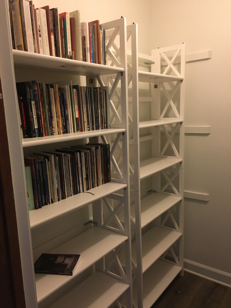 I went with bookcases instead of build-ins because I know I won’t be in this house forever, and since my office is a bedroom, the next owners may want to use the closet as an actual closet – imagine! I know what it’s like to tear out book shelves. The previous owners of a house I once lived in converted a doorway into a mini library. The width of the door jamb was just the right size for their collection of paperbacks, so there were several shelves. Unfortunately for us, the door was one to the front porch (there was another door so we still had access to the porch), and by boarding it up, it cut off natural light into the room. Dismantling it was not easy – fun seeing it all go – but not fun doing it. So for my mini library, it was bookcases.