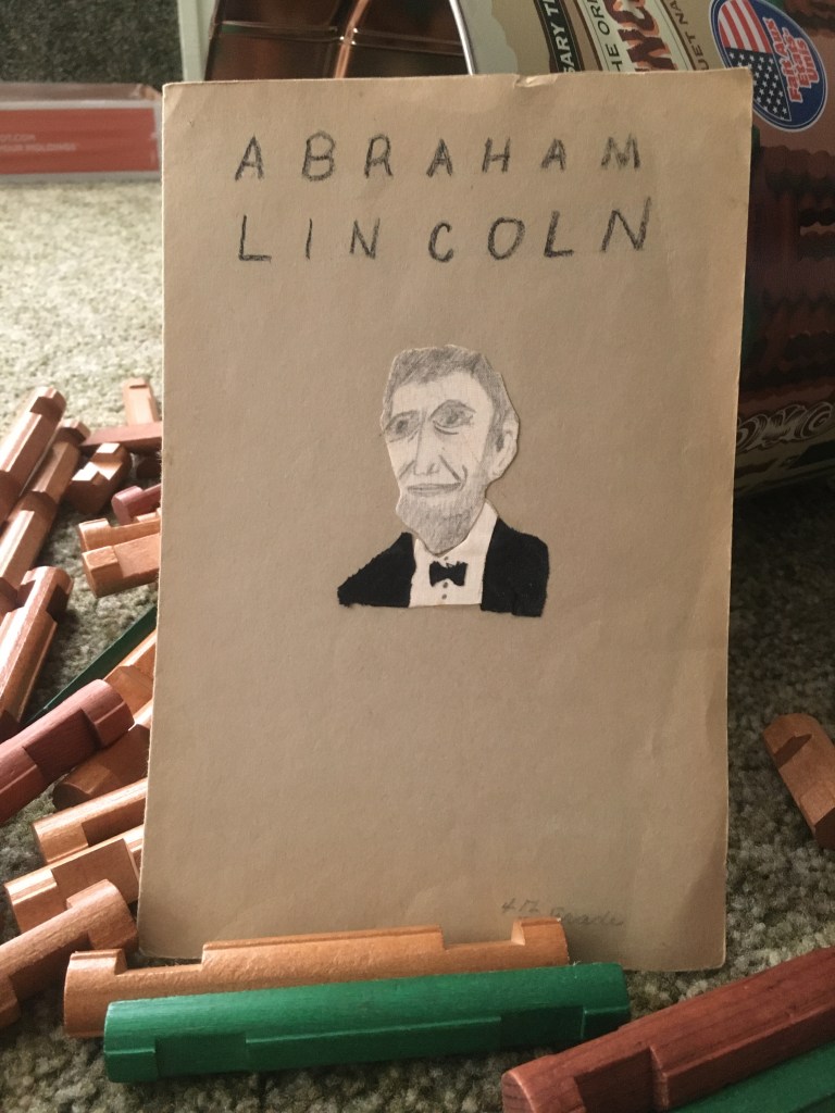 One book report I do remember had something to do with Abraham Lincoln. We were to put our reports, (in our best handwriting), in a nice construction paper cover – you know, fold a piece in half and paste the report inside and decorate the outside. I think they were to display for some kind of open house or something. I don’t remember this because of the book; I remember it because this was the only time Dad ever did part of my homework for me. He sketched Lincoln’s face for the cover. I honestly tried, but I wasn’t much of an artist and I’m sure my attempt looked more like one of Maurice Sendak’s Where the Wild Things Are monsters. Dad took pity (and to save the fibrous construction paper cover from getting a hole from all the erasures) and drew the small image of our 16th president.