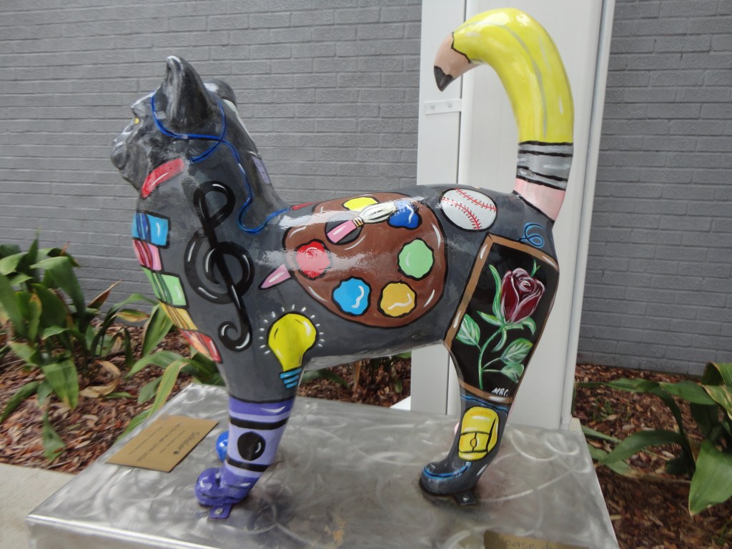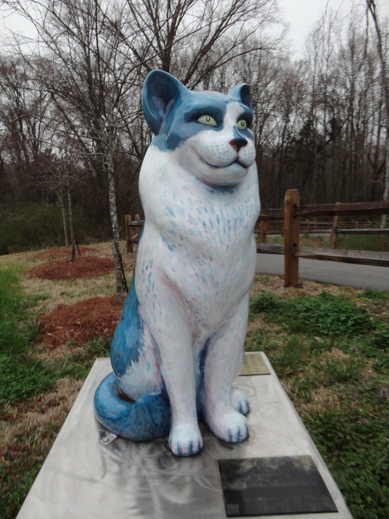 I’ve taken my local Grands to see several of them, it’s like a treasure hunt. They love them, know them by name and ask to have their pictures taken with them. I mean, who wouldn’t love a cat named Frida Katlo? Neither of these cats is Frida. Scholar hangs out in front of the library; Trace greets walkers to the greenway.
