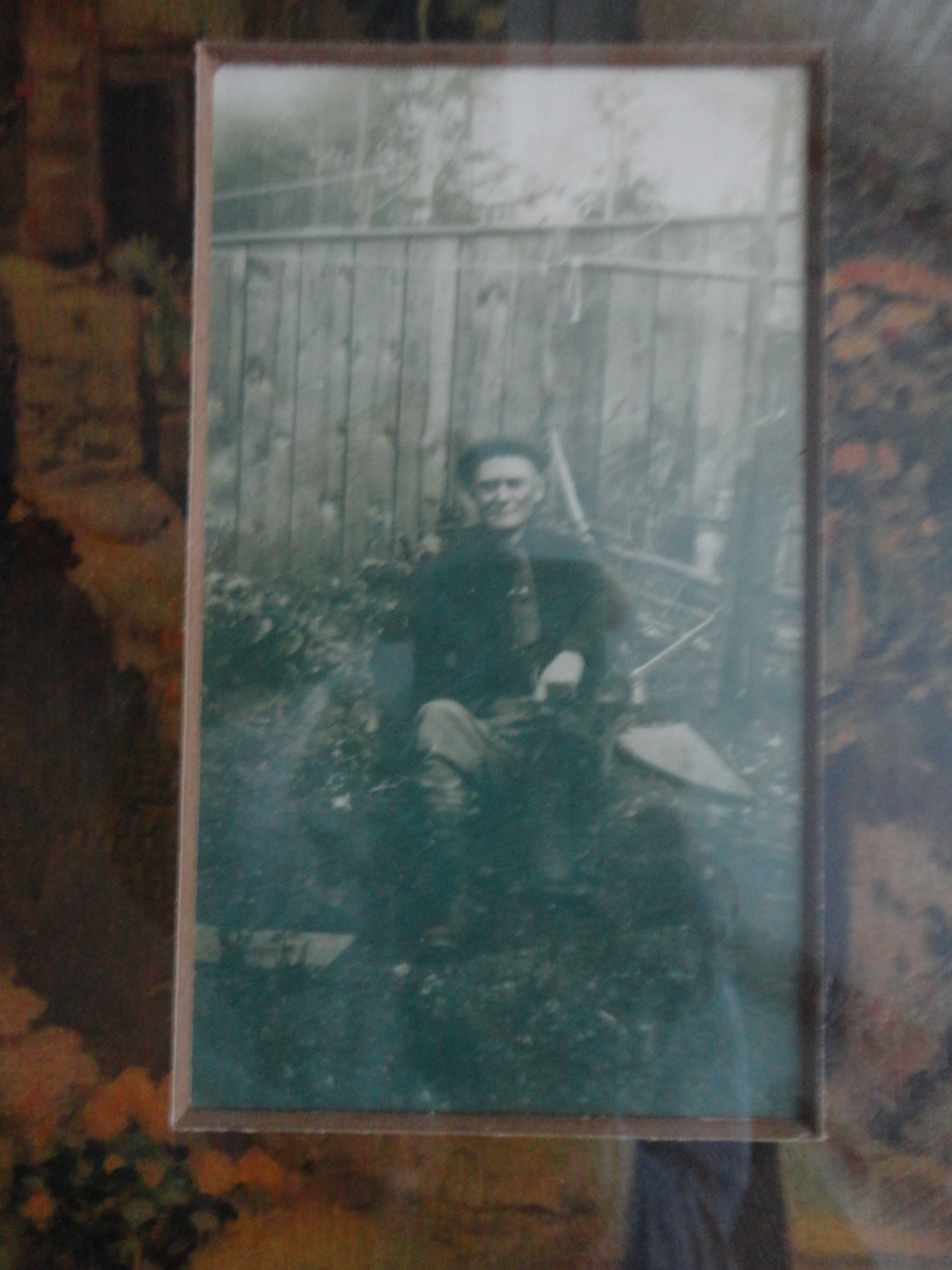 He’s wearing a cap, like a newsboy cap, a jacket, what looks like a tie, pants, boots. He’s dressed to have his photo taken, and there’s something of an immigrant or Old World look about the style of his clothing.