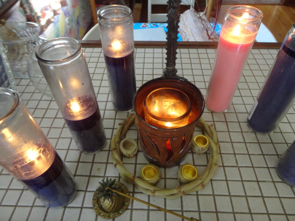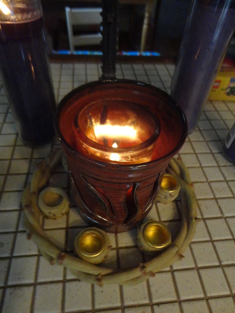 Sunday was the fourth Sunday of Lent, marking halfway to Easter. On Ash Wednesday I set up a little Lenten space to set the tone and mood for my daily meditations, nothing fancy, just a reminder of the season. As if the meditations themselves wouldn’t be reminder enough! The candles are from my Advent wreath, which aren’t only symbolic but also my being frugal. I mean, there’s still plenty of wick and wax left. The central candle is the one I used for my 12 Days of Christmas, so a transition of sorts from one liturgical season to the next. The metal crucifix belonged to my dad, and I wouldn’t be surprised if it once belonged to my grandparents. When my sisters and I shared family treasures after dad’s death, it came home with me.