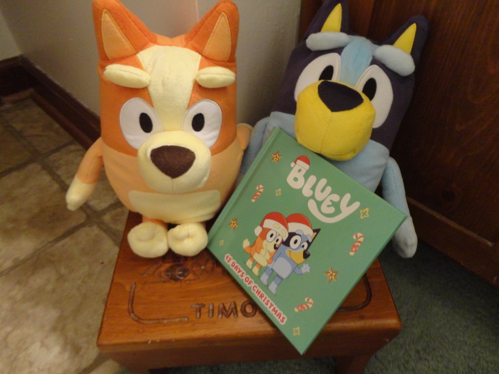 Adding to the amusement of these breaks in play, is older brother bringing in Bluey and Bingo–who have voice boxes and say 9 different sentences each!–and we have conversations. One asks, Would you like to buy a statue? and the other answers, ‘You have to find faeries with your heart.’ both in their adorable Australian voices. I do my best mimic of the accent answering, and ‘exasperated’ our singing keeps getting interrupted.