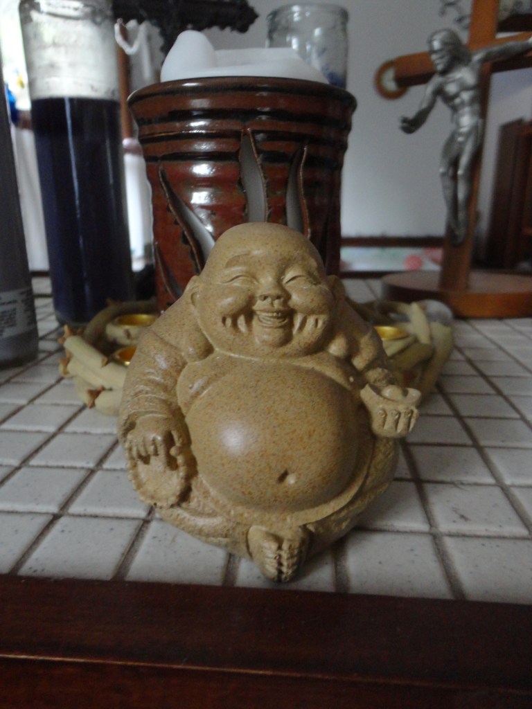 The first time I saw a laughing Buddha was ages ago at my Aunt Myrtle and Uncle Roy’s. She practiced yoga and Eastern meditation when it first became popular in the 60s, and her little Buddha was tucked on a corner table. Both she and my uncle embodied joy, Uncle Roy’s send-off ‘Have a happy!’ instead of goodbye.