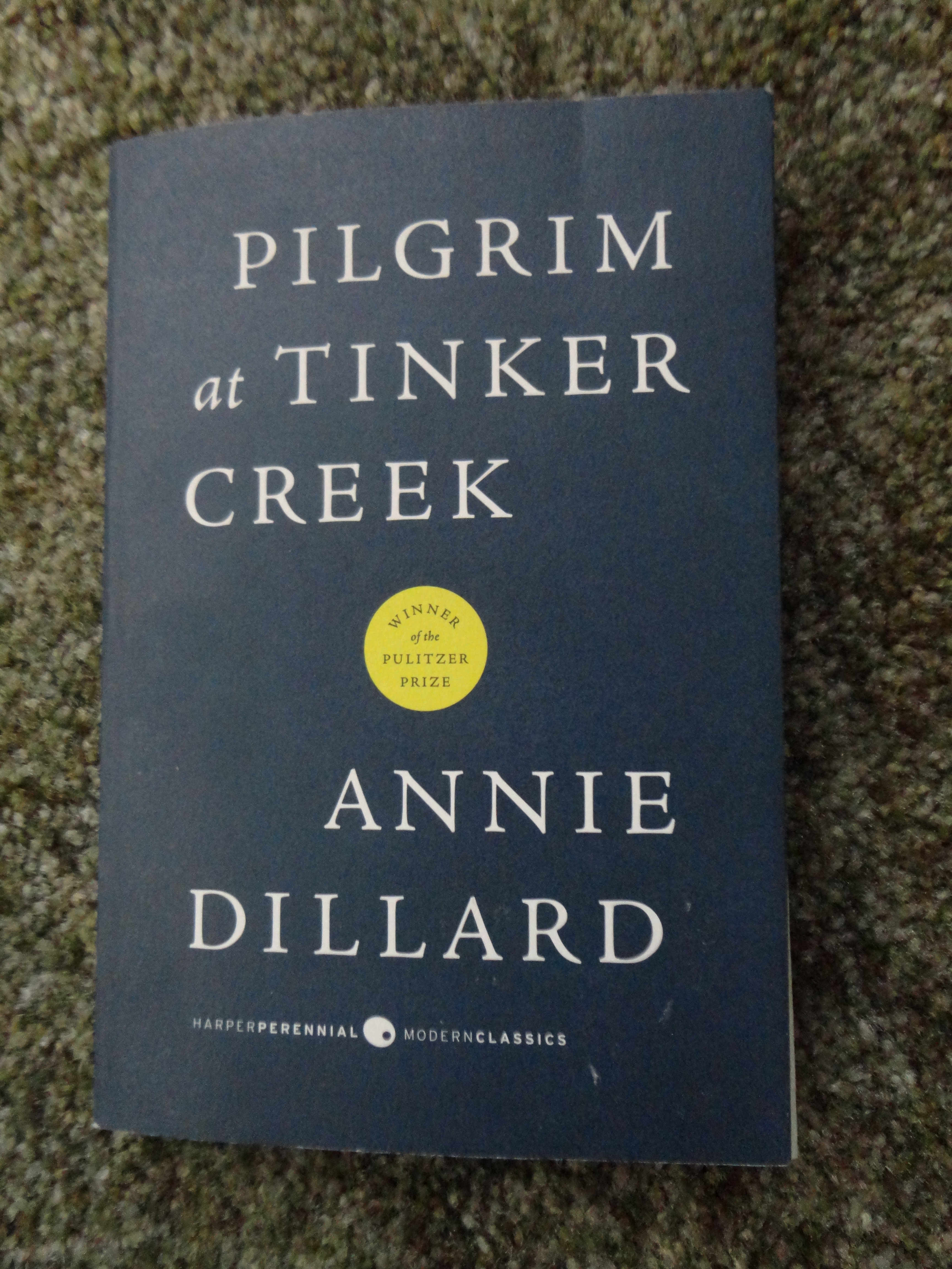 Pilgrim at Tinker Creek by Annie Dillard is the story of a dramatic year in Virginia’s Roanoke Valley. Her personal narrative highlights one year’s exploration on foot in the Virginia region through which Tinker Creek runs …The result is an exhilarating tale of nature and its seasons. I read this at night, sinking into Dillard’s beautiful prose and descriptions. I want to see and write about my little plot of land like she saw and wrote about hers.