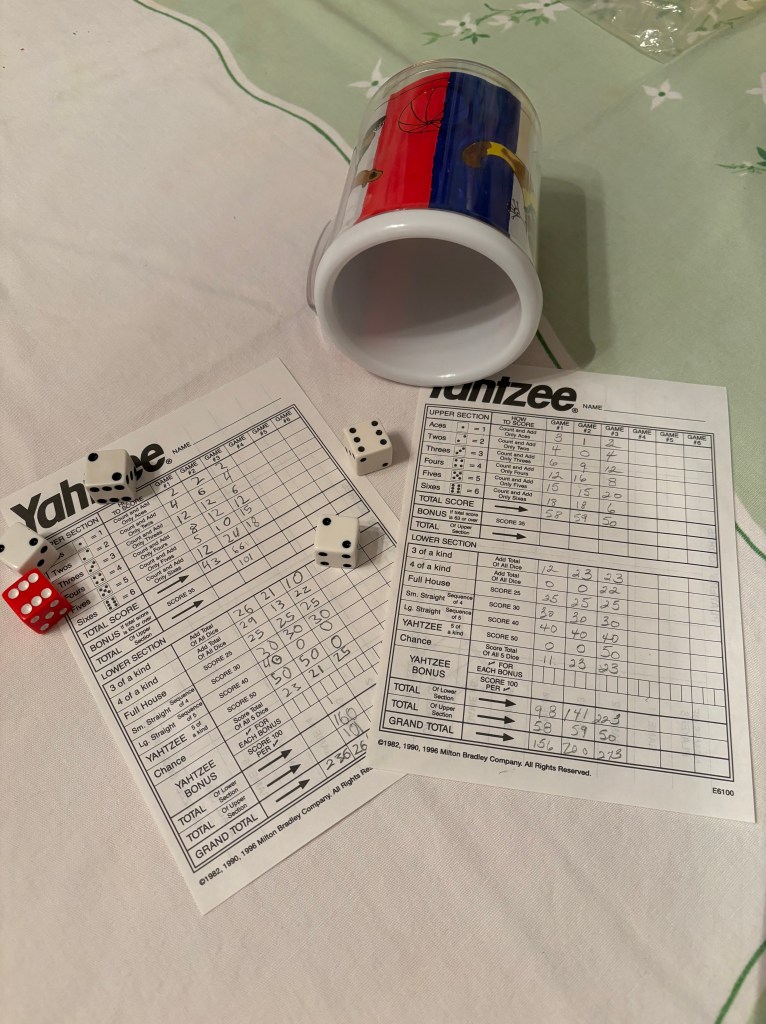 Instead of the individual Christmas gingerbread house decorating, games were played in different groupings with K and D showing the younger ones how to play Cootie, and building with Lincoln Logs, and bowling with plastic ball and pins down the entrance hallway; but K also had a deep conversation with one aunt about homeschooling–K and D are homeschooled and so is one of their cousins. Later, there was an hour-long political discussion with K and 3 of the adults.