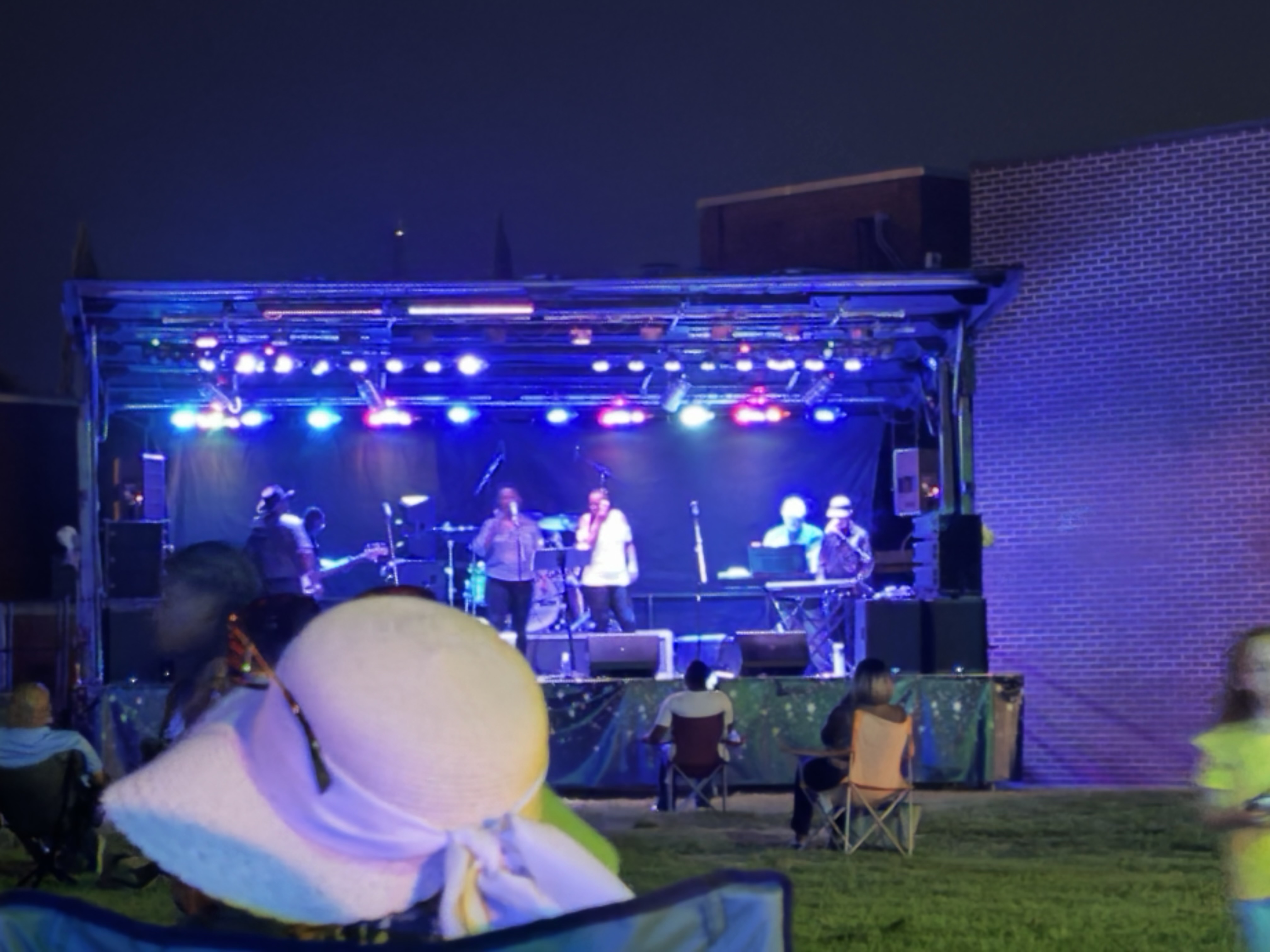 In Carolina in the Morning Al Jolson sings, ‘Nothing could be finer than to be in Carolina in the morning …’ but this past Friday it was the evening that couldn’t have been finer. After a week of activities with the Grands and a day of errands, I decided to relax at our town’s Finally Friday event that takes place on the third Friday of the month during the summer. I took my hippie camp chair and journal, and set my phone alarm for 8:30–a half hour before the event was scheduled to end–and settled back for music by two live bands, Sho-Tyme and Cleo White and the Identity Band. I just planned to absorb the sights and sounds of the night. Planned to.