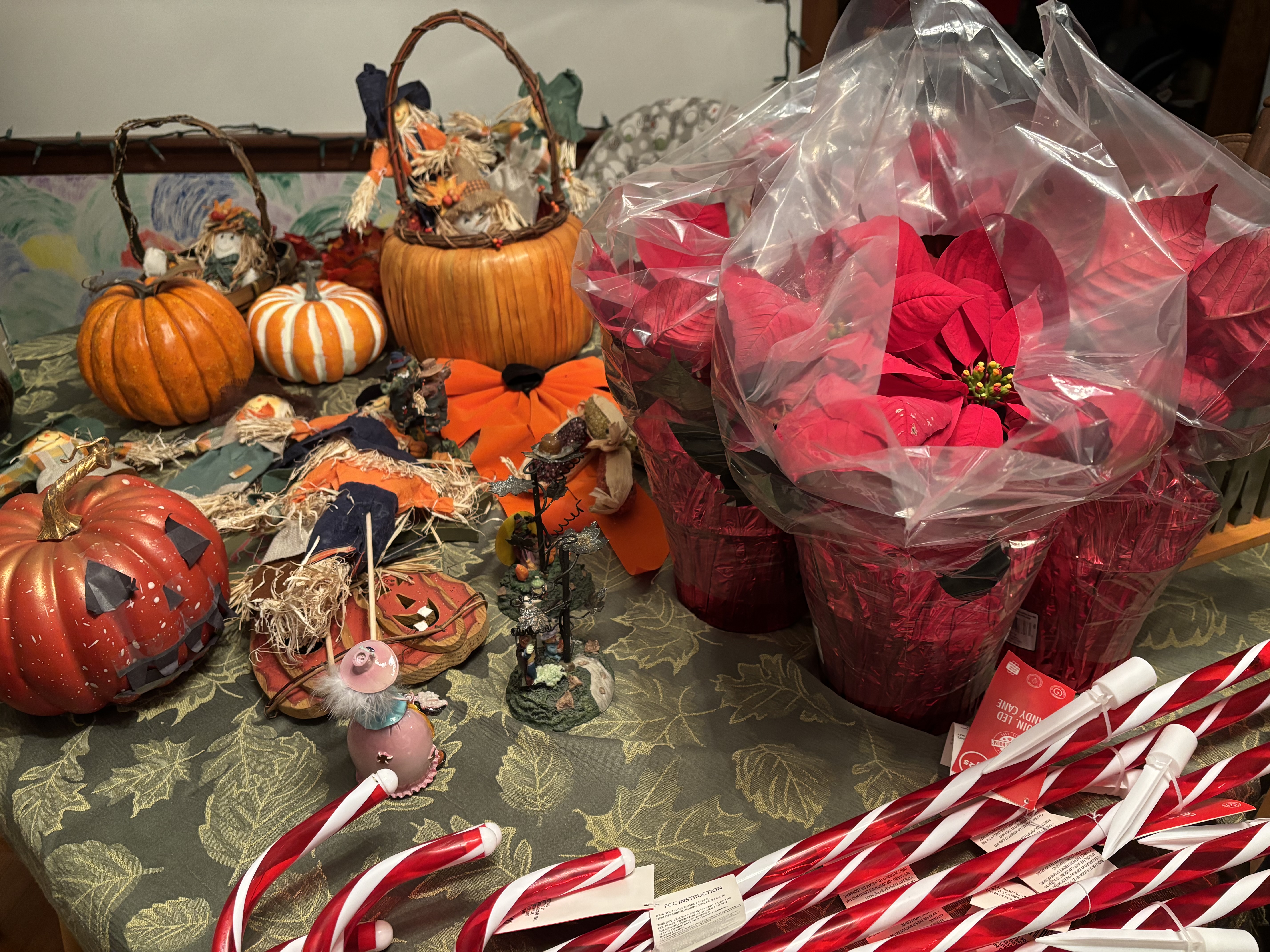 Instead of having that one afternoon of erasing one season, in-between going out, returning to drop off packages, heading out, returning to drop off a tree, bundling up for standing in the cold, I’d steal a minute or two and gather Thanksgiving signs, pluck fall foliage, or round up scarecrows. Everything’s cozy in one place, even if that place isn’t in the boxes where it belongs.