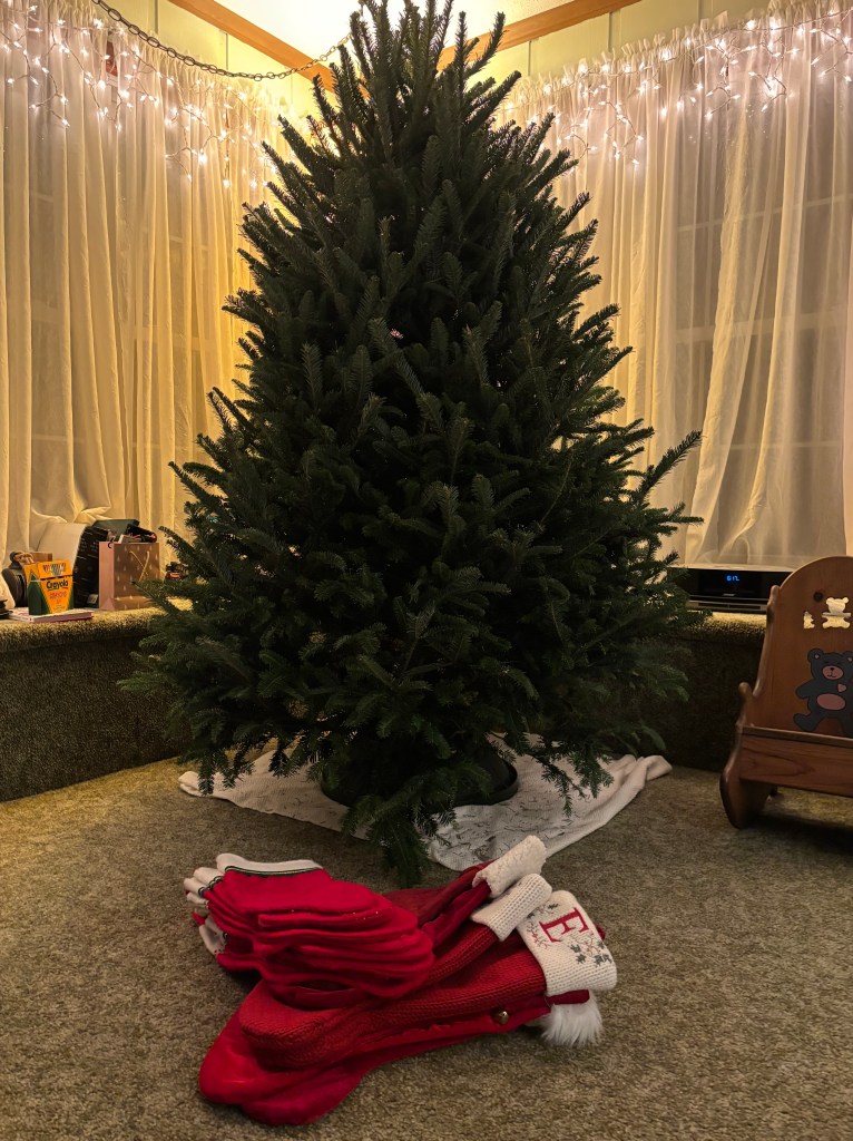 We kept busy doing post-Thanksgiving activities over the weekend: supporting local businesses on Friday and Saturday at a local craft show, a gift shop, and of course an independently-owned bookstore. We bought our Christmas tree from a family-owned farm from Western North Carolina. We’d been concerned how or even if they’d survived Helene (notice we don’t even have to identify it with ‘hurricane’ because everyone knows) and were relieved for them when we saw their pop-up forest planted in a bank lot where it’s been for the last several years. (They did lose about 1500 trees, a barn and a couple trucks, and their road and bridge to the farm were washed away. And yet, they had these huge smiles on their faces and were filled with gratitude that none of the family lost their homes and no one was hurt.).