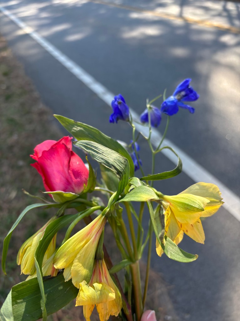 I’d not thought to bring flowers. Another woman insisted I take some of hers. I will forever be grateful she offered. This is the only photo I took, anything more felt irreverent or an intrusion. Even the whispers stopped as the blue lights of the police escorts came into view. Then all of a sudden, the monks were there! They appeared so quietly. Most of us bowed in respect. I was close enough their saffron-colored tunics were mere inches from my hands, I could see the fibers, sense the weight of the cloth; I could see the creases in their faces as they smiled, and the joy in their eyes. Kindness. Peace. Benevolence. My daughter-in-love later described her experience saying it was as if they floated by. Yes.
