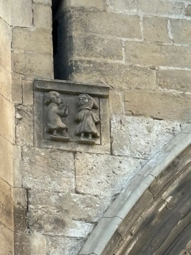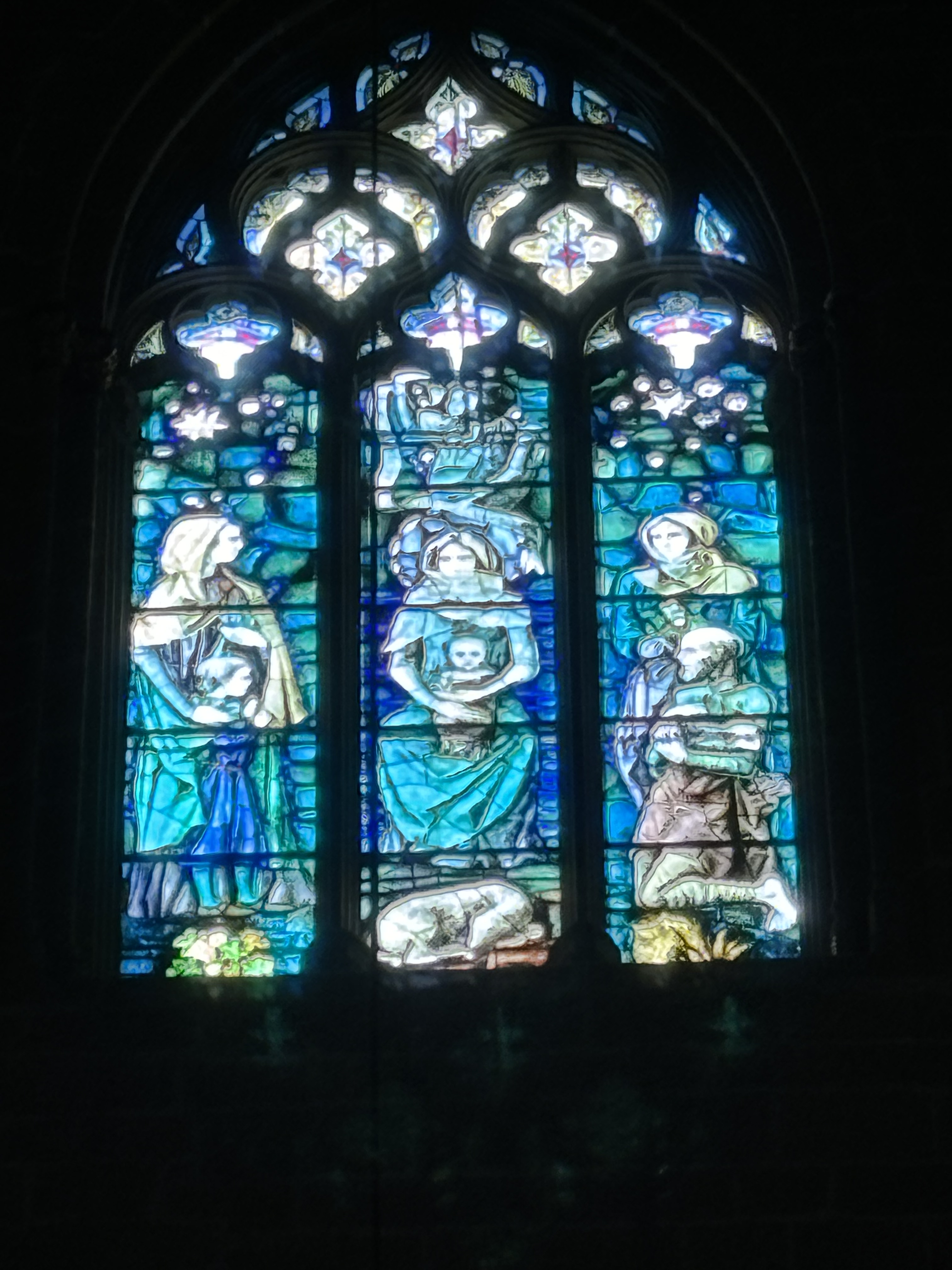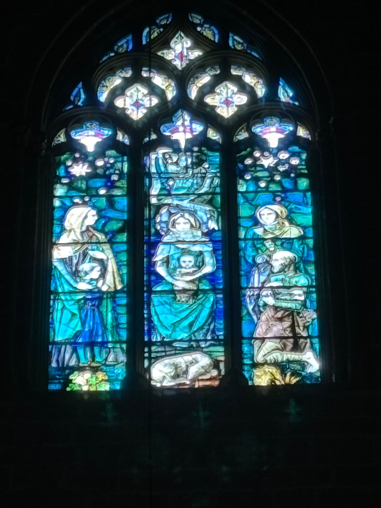 We flew out of Charlotte on April 21, and arrived in Pamplona on the afternoon of April 22. We wouldn’t officially start our almost 500 mile walk until the next day, yet we still spent the afternoon walking! The stained-glass window was in the Church of St. Lorenzo, just around the corner from our hotel, in a large plaza in Pamplona. St. Lorenzo’s was the first of many churches–very small to very large–we visited and the hundreds of beautiful stained-glass windows we saw. This window, to me, was reassurance we’d be watched over along the way. While the Camino is the Way of St. James, The Blessed Mother was an image that appeared in windows, bas relief, and statuary at just the right moments.