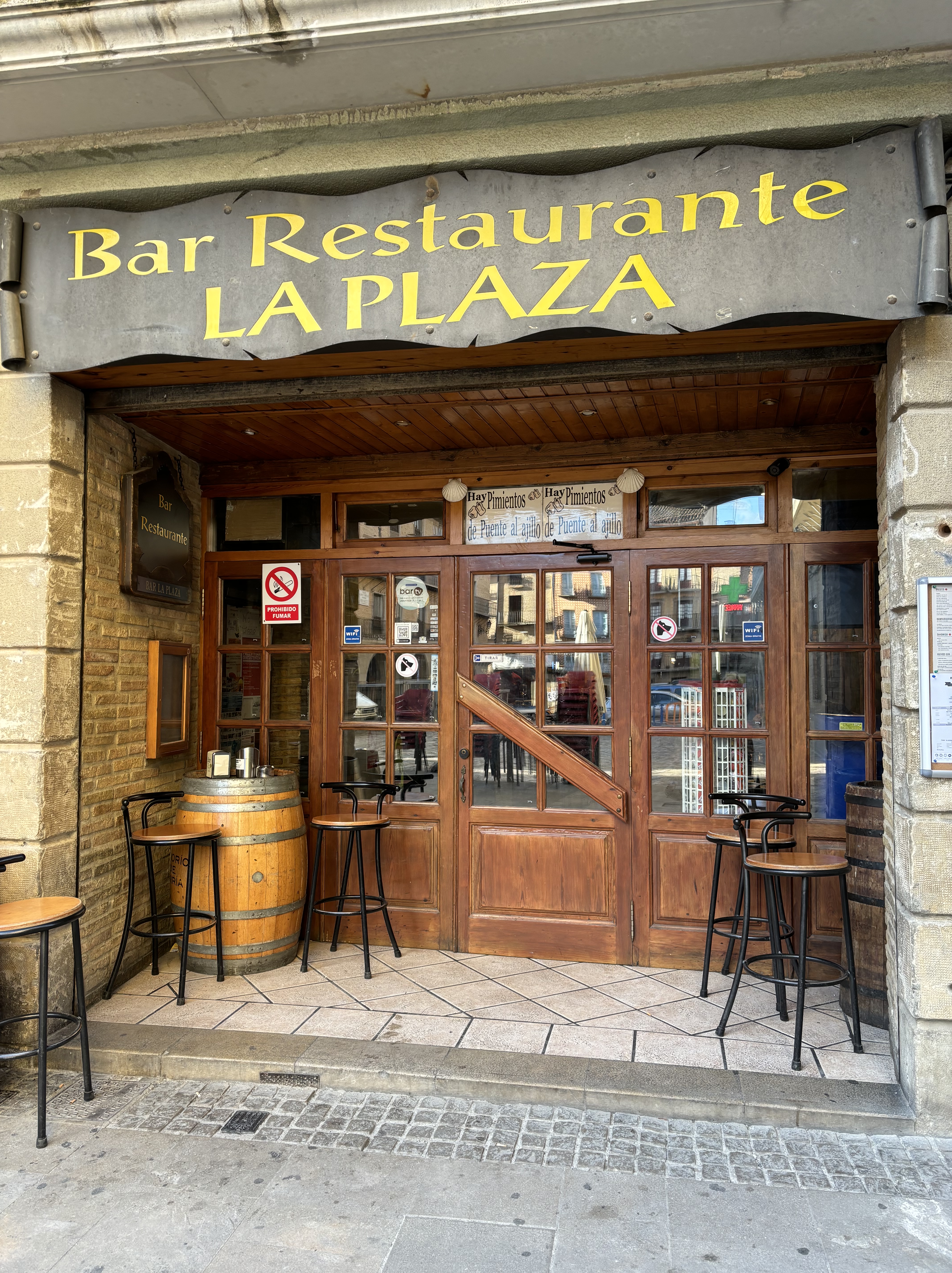 La Plaza was the home of our first official Spanish meal, a pilgrim’s meal on the eve before our first day of our walk. Most restaurants have a specific pilgrims’ meal–consisting of a salad or soup, main course, and dessert. In some cases, also more wine than we’d ever drink! The courses vary from one place to another, and we never had a bad one. At La Plaza I had artichoke hearts with chicken in a sauce and flan for dessert. Hubby had grilled veal. According to my notes, both were delicious.
